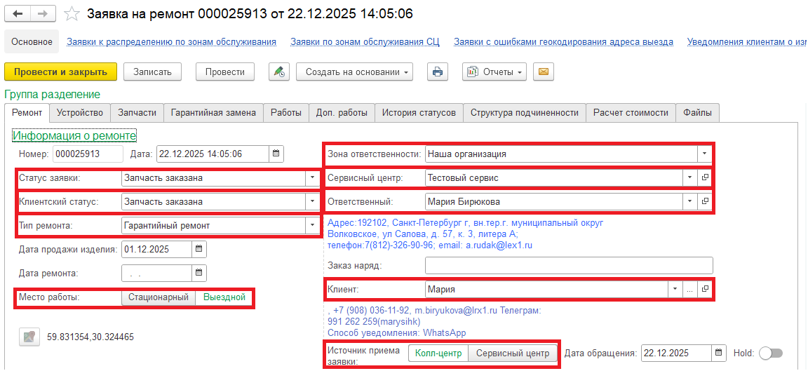 4.Для проведения заявки необходимо заполнить следующие поля на вкладке “Ремонт”: